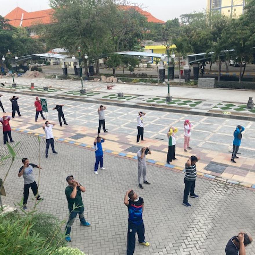 Pagi ini (16/9/2022) dilaksanakan salah satu kegiatan rutin yang diselenggarakan oleh Fakultas Farmasi Universitas Airlangga (FF UNAIR) setiap hari jum'at, yaitu senam pagi bersama.
