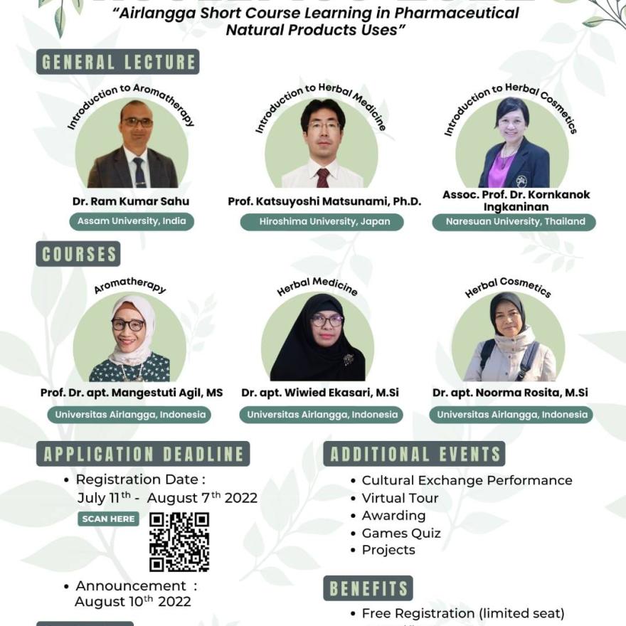 BEM FF UNAIR present Airlangga Short Course Learning in Pharmaceutical Natural Products Uses 2022. Registration starts from July 11th - August 7, 2022. Set your alarm!