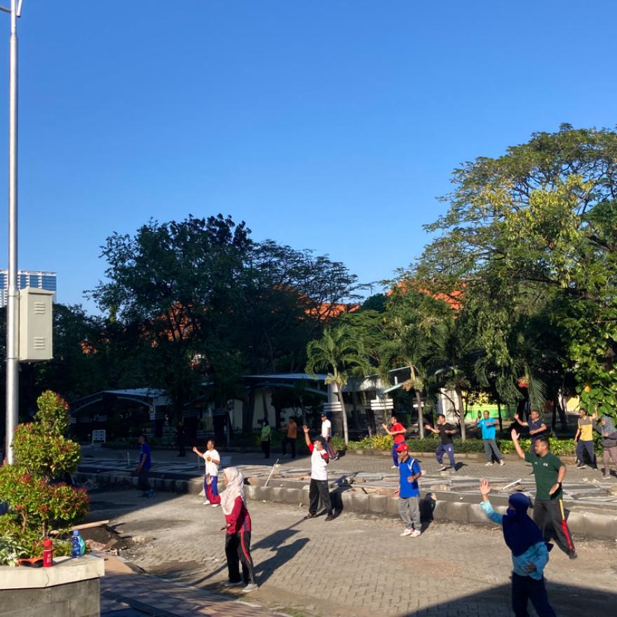 Setelah sempat ditiadakan karena menghormati para staf muslim yang sedang menjalankan ibadah puasa arafah, senam pagi kembali diadakan oleh FF UNAIR pada Jum'at ini (15/7)