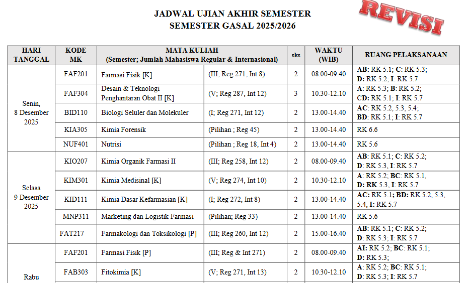 Jadwal Ujian Akhir Semester - Semester Gasal 2025/2026 FFUNAIR 06 Desember 2025 Jadwal Ujian Akhir Semester - Semester Gasal 2025/2026 Unduh Jadwal