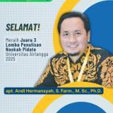 Selamat kepada Bapak apt. Andi Hermansyah, S.Farm., M.Sc., Ph.D. meraih Juara 3 Lomba Penulisan Naskah Pidato 2025 yang diselenggarakan oleh UNAIR