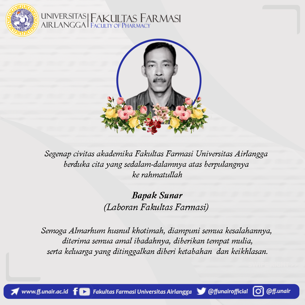 Segenap civitas akademika Fakultas Farmasi Universitas Airlangga berduka cita yang sedalam-dalamnya atas berpulangnya ke rahmatullah, Bapak Sunar (Laboran Fakultas Farmasi) pada Minggu 5 Februari 2023 pukul 15.30 WIB.