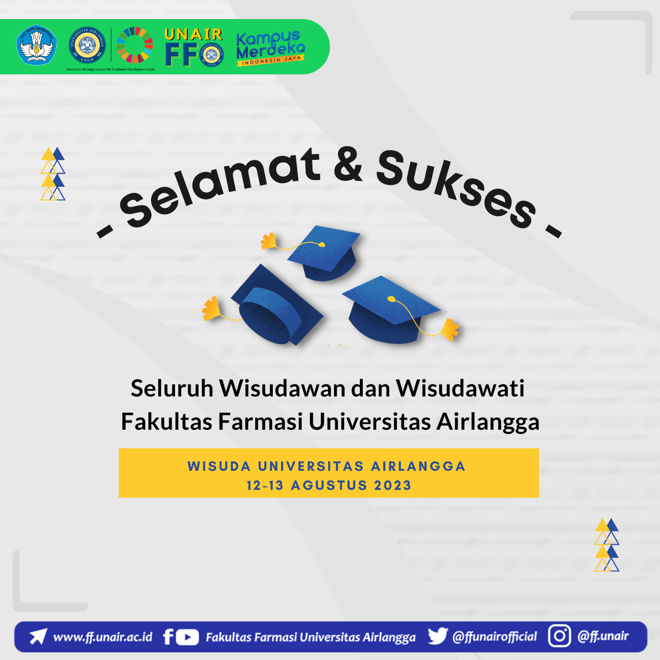Selamat dan Sukses kepada seluruh Wisudawan dan Wisudawati Fakultas Farmasi Universitas Airlangga (FF UNAIR) pada Wisuda 12-13 Agustus 2023.