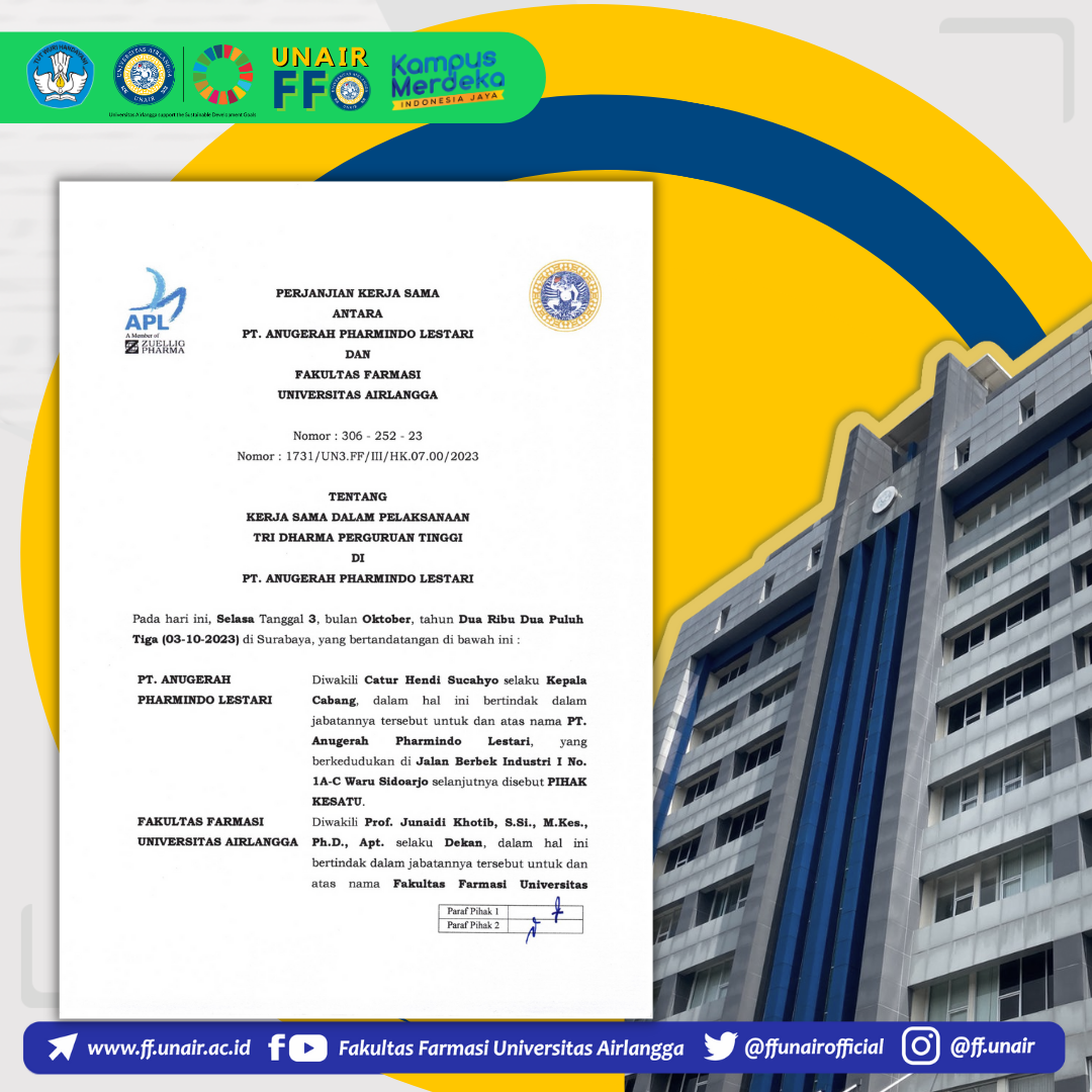 Fakultas Farmasi Universitas Airlangga (FF UNAIR) kembali memperluas koneksi dengan perusahaan farmasi. PT. Anugerah Pharmindo Lestari menambah daftar mitra FF UNAIR dari bidang industri kefarmasian. Naskah perjanjian kerjasama telah ditandatangani pada 3 Oktober 2023 lalu yang akan berlaku salama 2 tahun sejak itu.