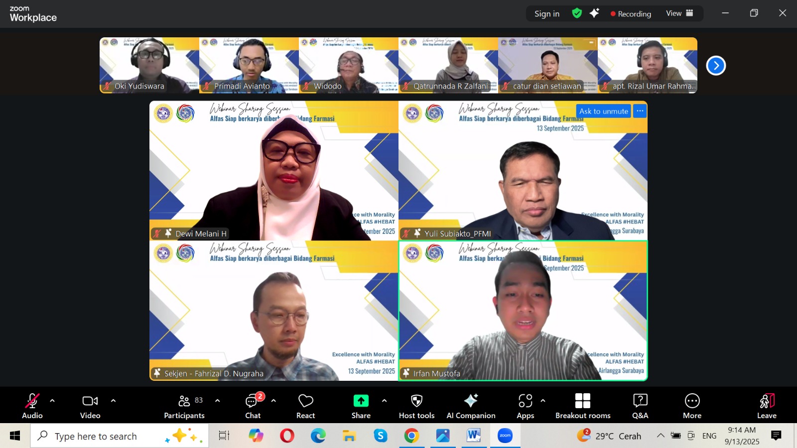 Fakultas Farmasi Universitas Airlangga (FF UNAIR) bersama dengan Ikatan Alumni Farmasi Airlangga (ALFAS) sukses menyelenggarakan Webinar Sharing Session bertajuk “Alfas Siap Berkarya di Berbagai Bidang Farmasi” pada Sabtu, 13 September 2025. Kegiatan yang berlangsung melalui platform Zoom Meeting ini dihadiri oleh ratusan peserta dari kalangan alumni, mahasiswa, serta civitas akademika FF UNAIR.
