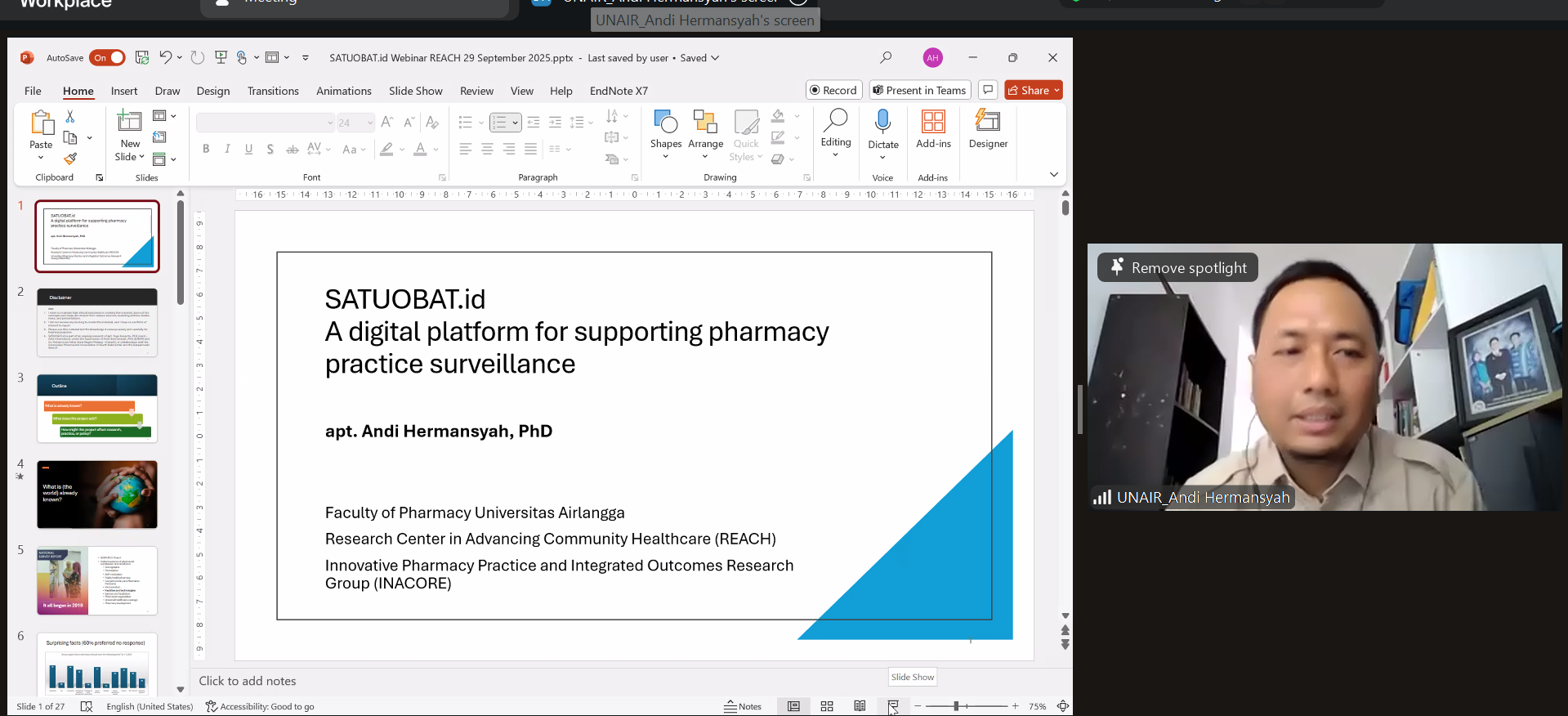Bapak apt. Andi Hermansyah, S.Farm., M.Sc., Ph.D., dosen Fakultas Farmasi Universitas Airlangga (FF UNAIR) dipercaya menjadi salah satu pembicara pada Webinar Inspiratif: From Research to Industry: Driving Innovation for Community Well-Being dengan tema “Transforming Ideas into Solutions that Empower Communities”.