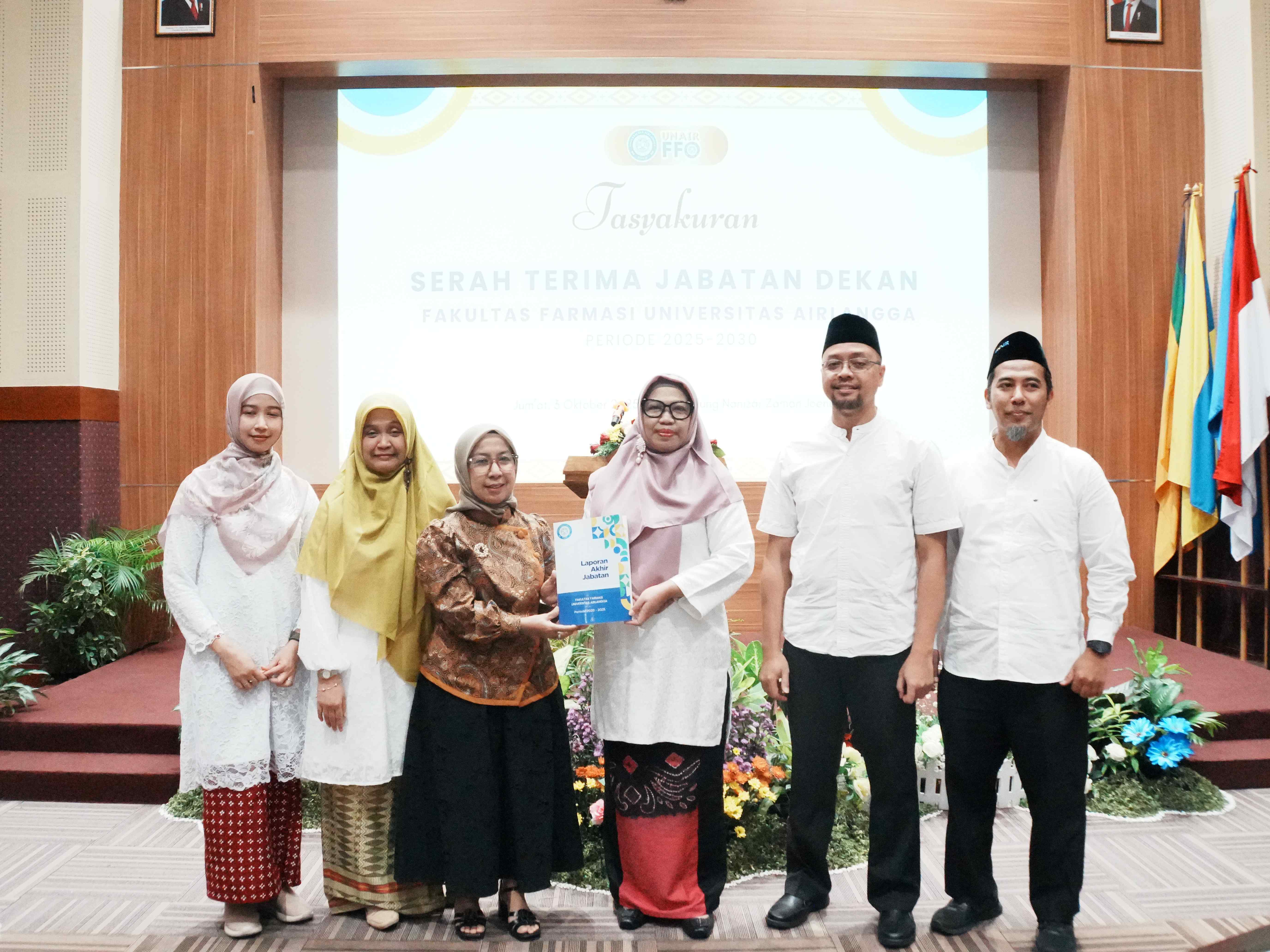 Dekan FF UNAIR periode 2020–2025, Prof. apt. Junaidi Khotib, S.Si., M.Kes., Ph.D., yang diwakili oleh Plt. Dekan Dr. apt. Riesta Primaharinastiti, S.Si., M.Si., secara resmi menyerahkan jabatan kepada Prof. apt. Dewi Melani Hariyadi, S.Si., M.Phil., Ph.D. untuk memimpin FF UNAIR selama lima tahun ke depan.