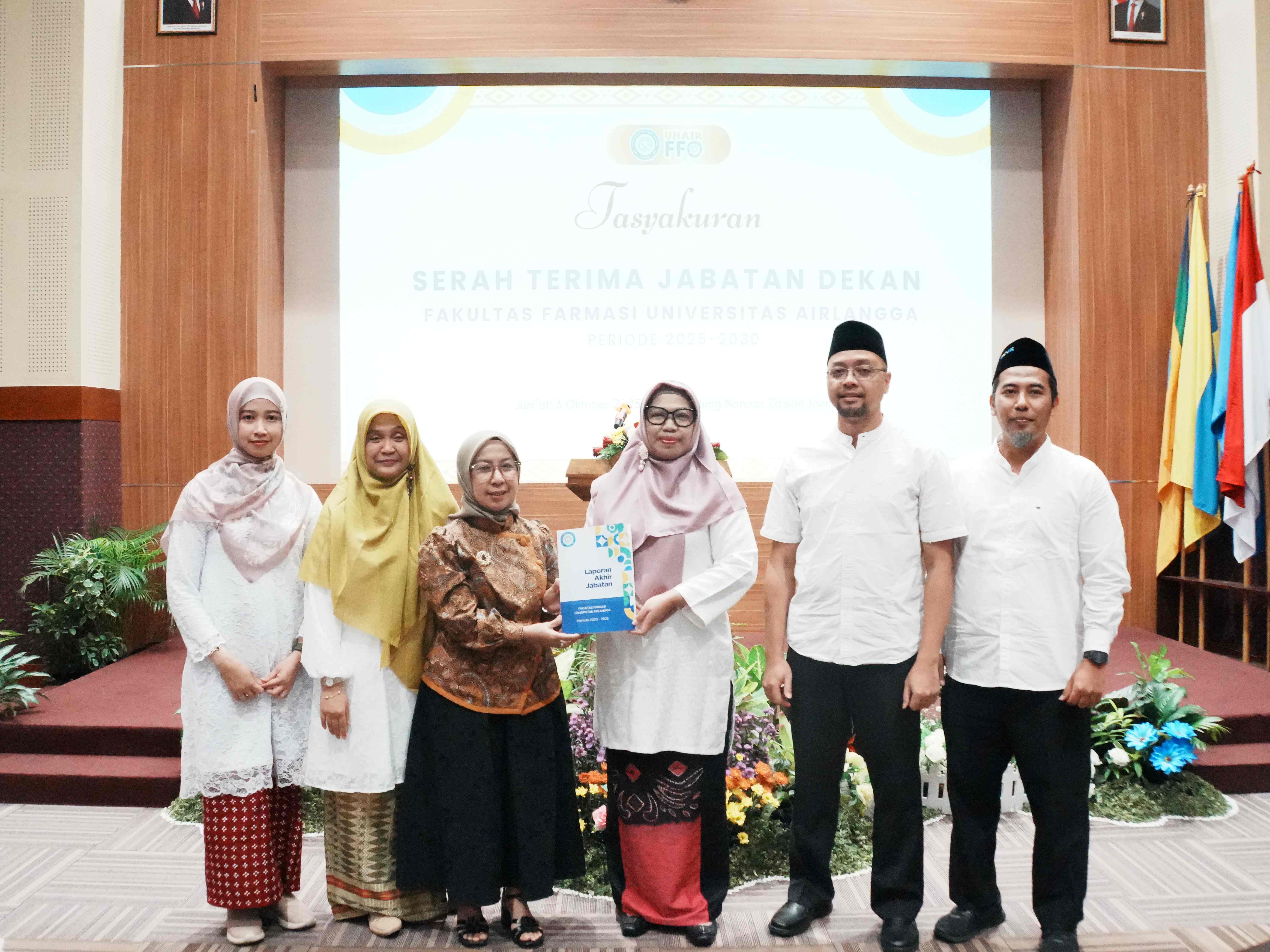 The Dean of FF UNAIR for the 2020–2025 period, Prof. apt. Junaidi Khotib, S.Si., M.Kes., Ph.D., represented by Acting Dean Dr. apt. Riesta Primaharinastiti, S.Si., M.Si., officially handed over the position to Prof. apt. Dewi Melani Hariyadi, S.Si., M.Phil., Ph.D., to lead FF UNAIR for the next five years.