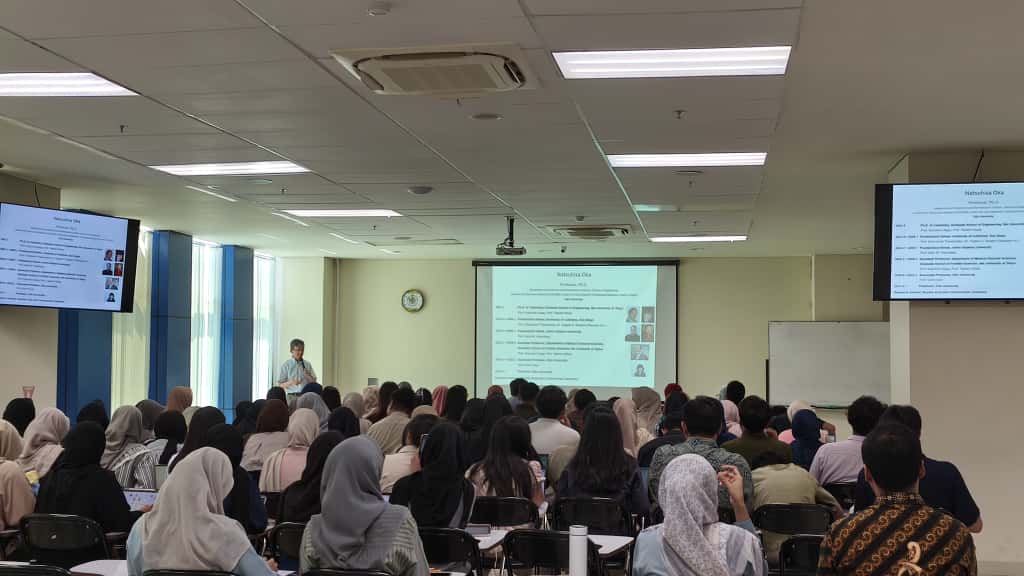Kuliah tamu tersebut dihadiri oleh ratusan mahasiswa serta beberapa dosen yang antusias menyimak paparan ilmiah dari Prof. Oka. Dalam kesempatan ini, beliau membagikan penelitiannya yang berjudul “Design, Synthesis, and Biological Evaluation of Sugar- and Nucleotide-Conjugated Hydroxychloroquine Derivatives as Potential Antimalarial and Antivirals Agents.”