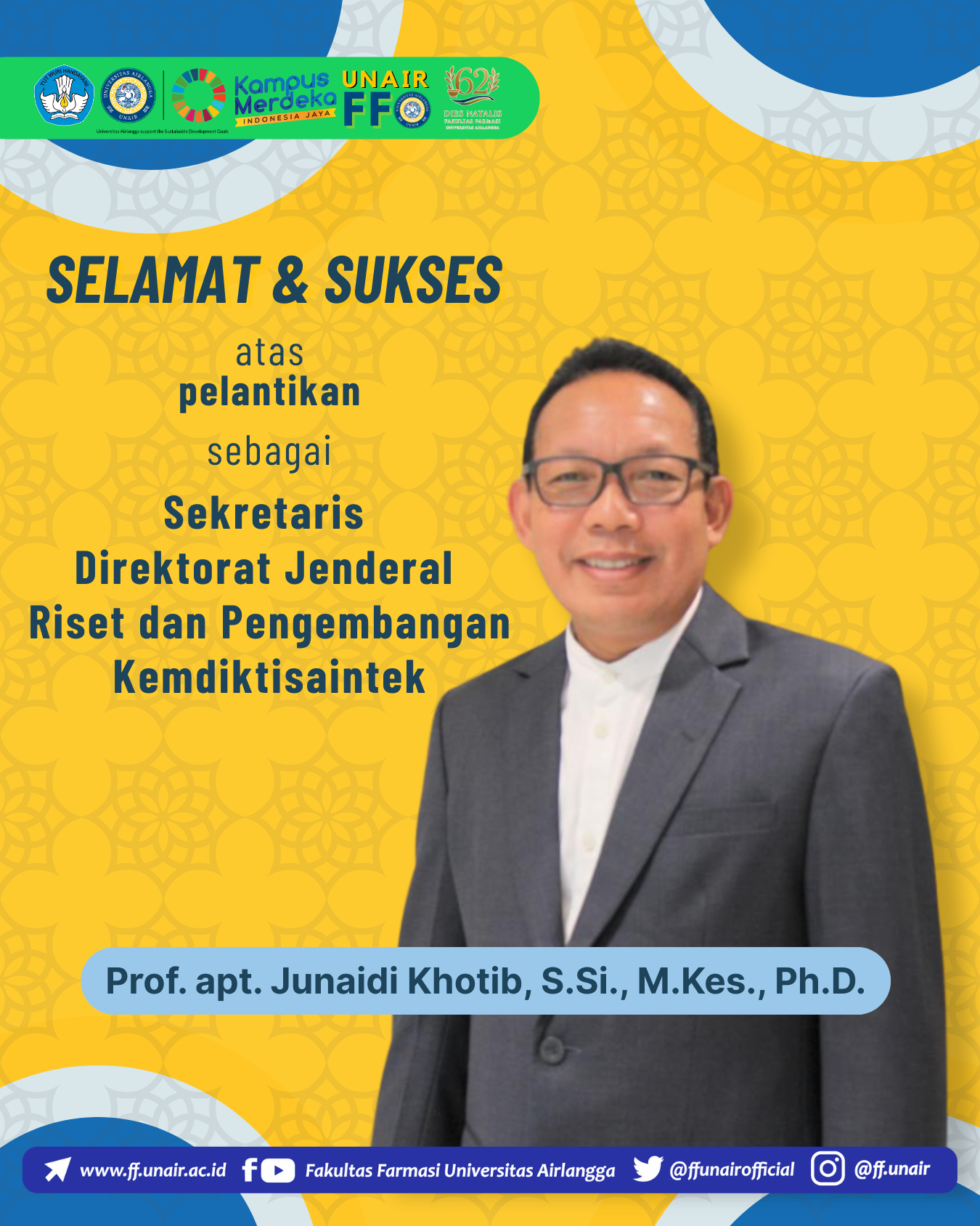 Seluruh Civitas Akademika Fakultas Farmasi UNAIR turut berbangga dan mengucapkan selamat atas pelantikan Prof. apt. Junaidi Khotib, S.Si. M.Kes., Ph.D. sebagai Sekretaris Direktorat Jenderal Riset dan Pengembangan Kemdiktisaintek