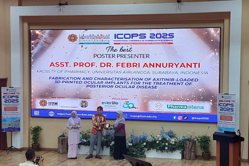 Dosen Fakultas Farmasi Universitas Airlangga (FF UNAIR), apt. Febri Annuryanti, M.Sc., Ph.D., mengharumkan nama institusi dengan meraih prestasi pada ajang bergengsi International Conference on Pharmaceutical Sciences (ICOPS) 2025. Pada konferensi bertaraf internasional yang berlangsung pada 25–27 November 2025 di Malaysia tersebut, Bu Febri berhasil meraih prestasi sebagai Best Poster Presenter.