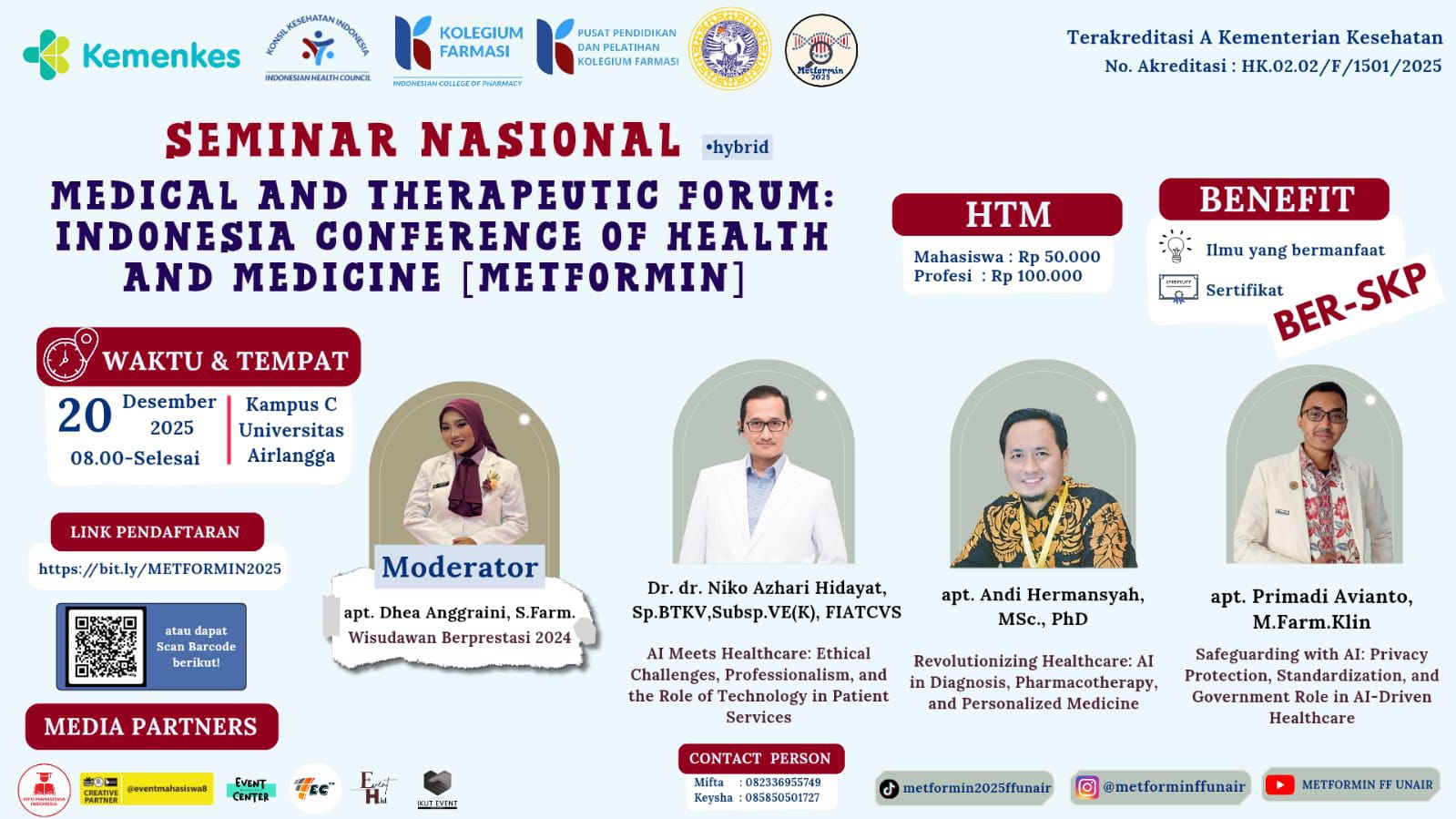 Kami mengundang seluruh mahasiswa, apoteker, tenaga vokasi, dan profesional kesehatan se-Indonesia untuk bergabung dalam METFORMIN 2025, sebuah seminar nasional yang membahas peran Artificial Intelligence dalam pelayanan kesehatan modern