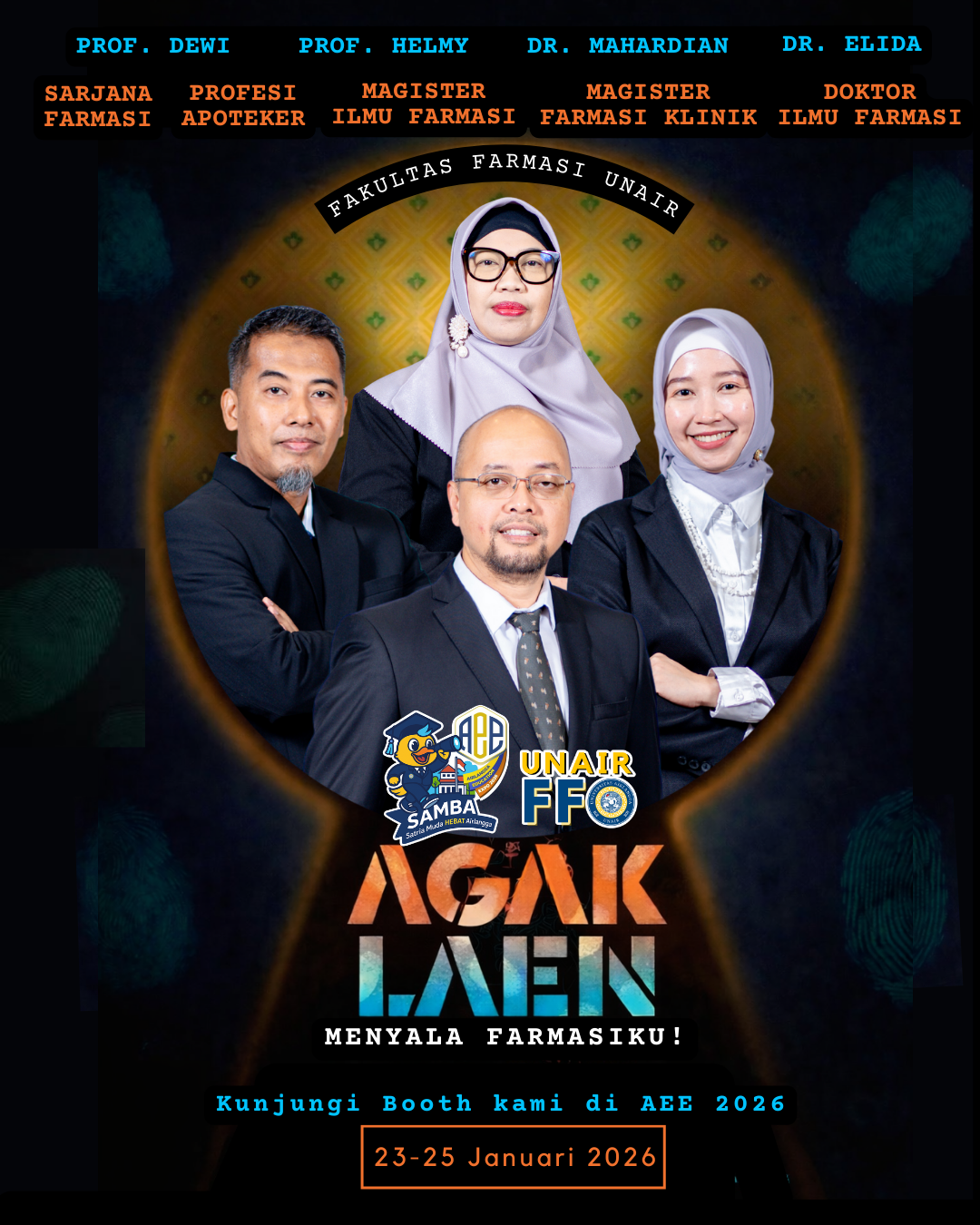 Ayo ramaikan booth Fakultas Farmasi di Airlangga Education Expo (AEE) 2026 yang akan dilaksanakan tanggal 23-25 Januari 2025 di Airlangga Convention Center, Kampus C Universitas Airlangga.