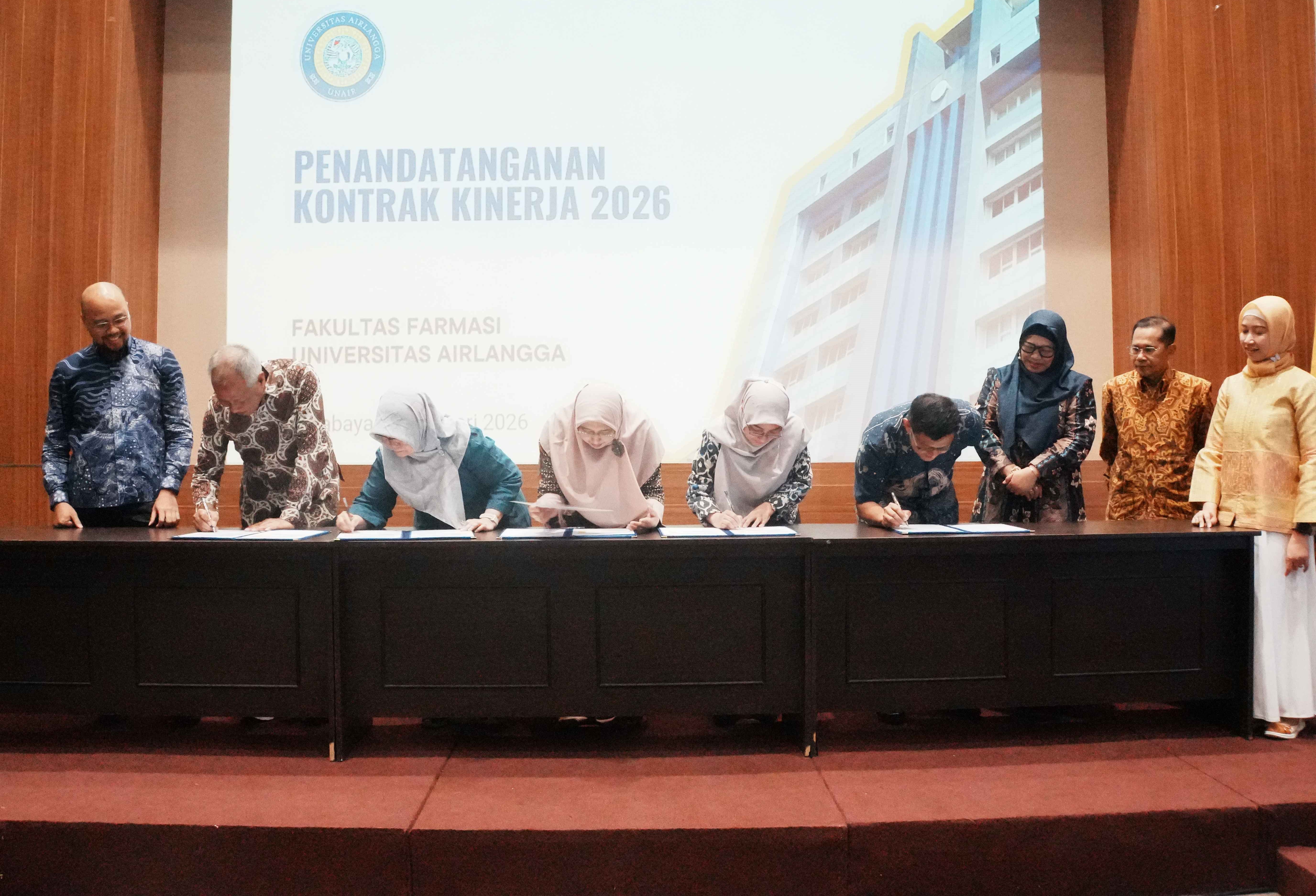 Penandatanganan kontrak kinerja dilakukan oleh dua Ketua Departemen, yaitu Ketua Departemen Ilmu Kefarmasian dan Ketua Departemen Farmasi Praktis. Selain itu, para Koordinator Program Studi turut menandatangani kontrak kinerja program studi masing-masing, meliputi Program Studi Sarjana Farmasi, Program Studi Profesi Apoteker, Program Studi Magister Ilmu Farmasi, Program Studi Magister Farmasi Klinik, serta Program Studi Doktor Ilmu Farmasi.