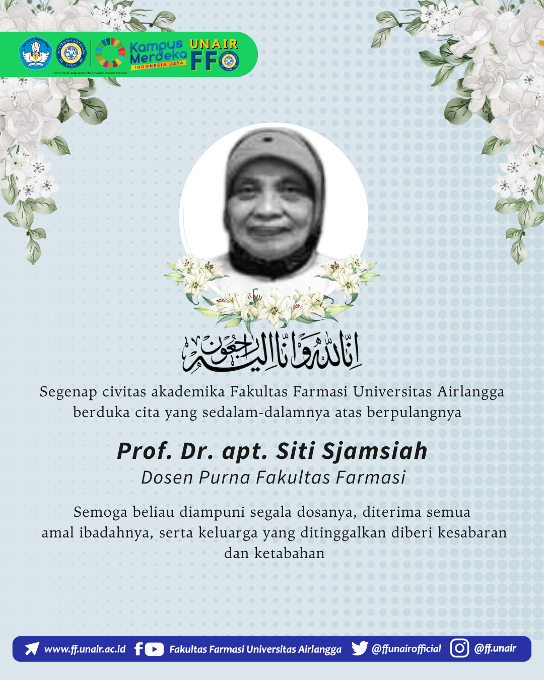 Innalillahi wainnailaihi rojiun. Segenap civitas akademika Fakultas Farmasi Universitas Airlangga berduka cita yang sedalam-dalamnya atas berpulangnya Prof. Dr. apt. Siti Sjamsiah (Dosen Purna Fakultas Farmasi)