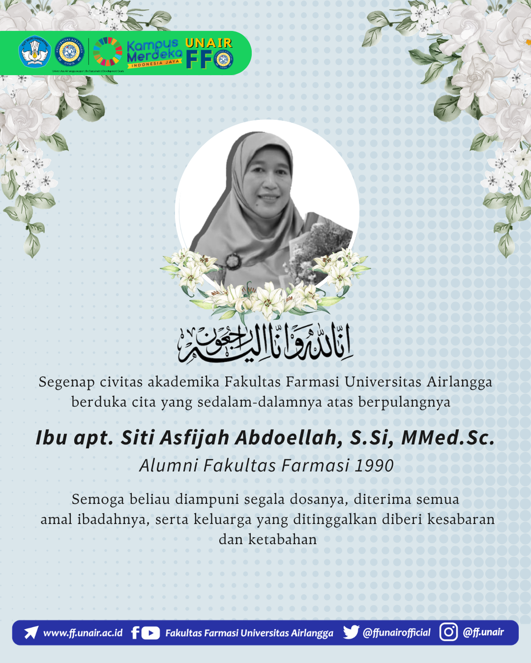 Innalillahi wainnailaihi rojiun. Segenap civitas akademika Fakultas Farmasi Universitas Airlangga berduka cita yang sedalam-dalamnya atas berpulangnya Ibu apt. Siti Asfijah Abdoellah, S.Si, MMed.Sc. (Alumni Fakultas Farmasi 1990)